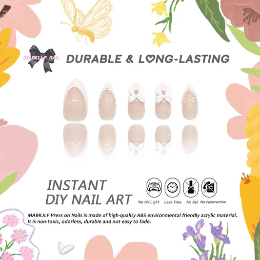 Cute Press on Nails Short Almond French Tip Fake Nails Nude Full Cover Pearl Bow Charm False Nails with Designs Glossy Glue on Nails Petite Acrylic Nails Artificial Nails for Women Girls 24Pcs